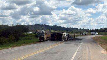 Carreta tomba na BR-494 e motorista fica ferido em Cláudio