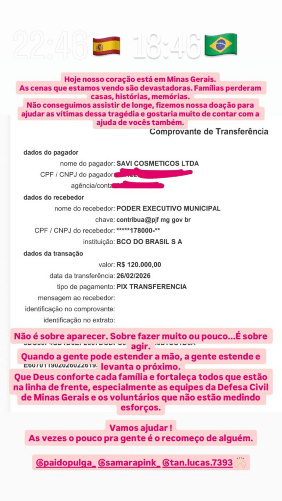 O valor foi destinado ao Poder Executivo Municipal para reforçar o atendimento emergencial em Juiz de Fora e Ubá, municípios que registraram impactos significativos com alagamentos e deslizamentos. A empresária compartilhou o comprovante da transferência nos Stories do Instagram e incentivou seguidores a contribuírem.